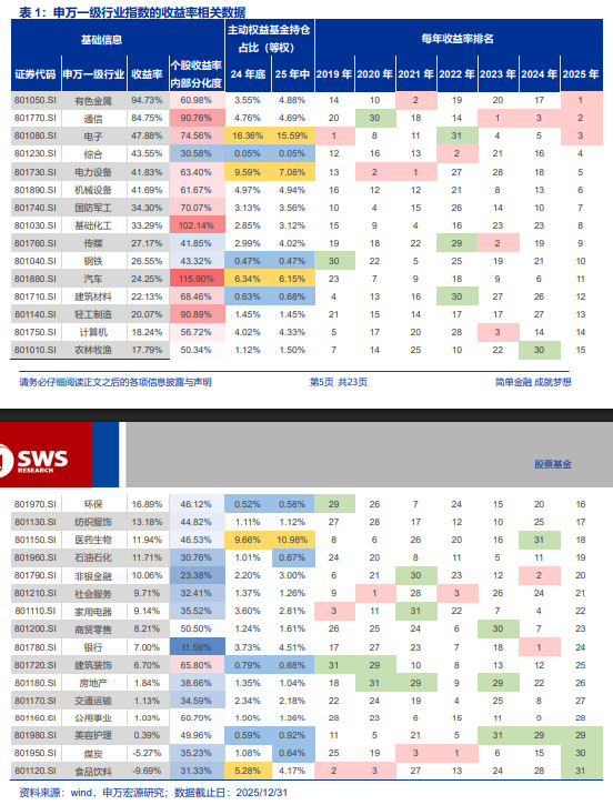 主动权益基金重仓的电子、电力设备行业全年分别上涨47.88%和41.83%,为基金贡献显著收益。而2024年表现靠前的银行和非银金融在2025年陷入相对劣势,过去三年持续靠后的有色金属则受贵金属强势表现成为收益率最高的行业。