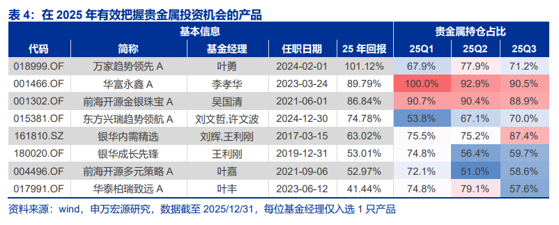 五大赛道主题机会轮番登场。贵金属是贯穿全年的稳定机会,万得贵金属指数全年涨幅超过111%。叶勇、李孝华、吴国清、刘文哲等基金经理有效把握了这一机会,其中华富永鑫的李孝华保持100%的贵金属持仓占比,全年收益达89.79%。这是"宏观理解加组合执行力"的胜利,适合评估基金经理对长期逻辑的坚守能力。
