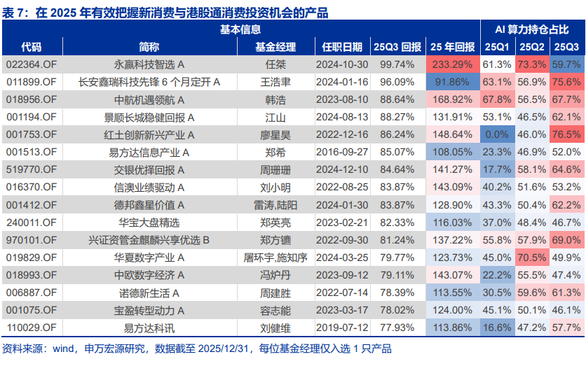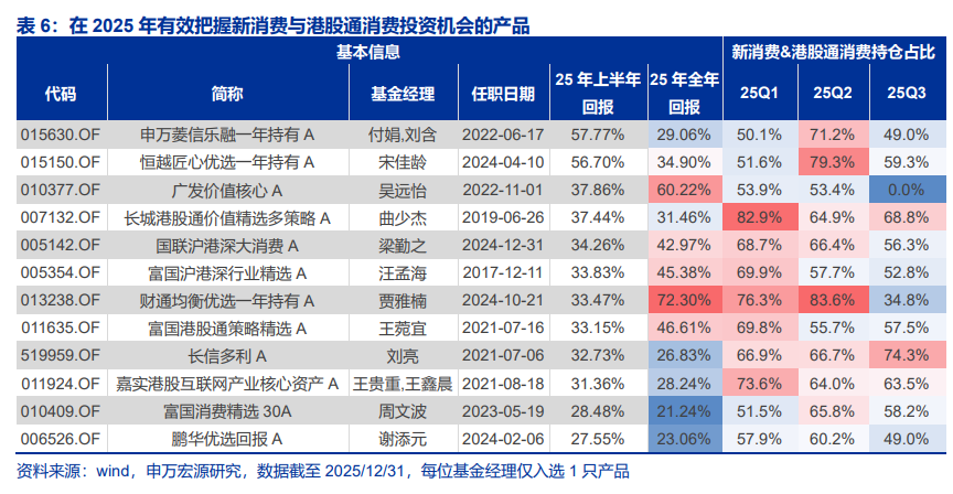 新消费与港股通消费是典型的上半年红利。以泡泡玛特、老铺黄金为代表的新消费上半年分别上涨198%和322%,但下半年转入下行。付娟、宋佳龄、吴远怡等基金经理把握了上半年机会,其中吴远怡在三季度显著减持,使其产品全年收益达60.22%。这提示赛道基金不等于好基金,必须结合"阶段胜率"来评价。