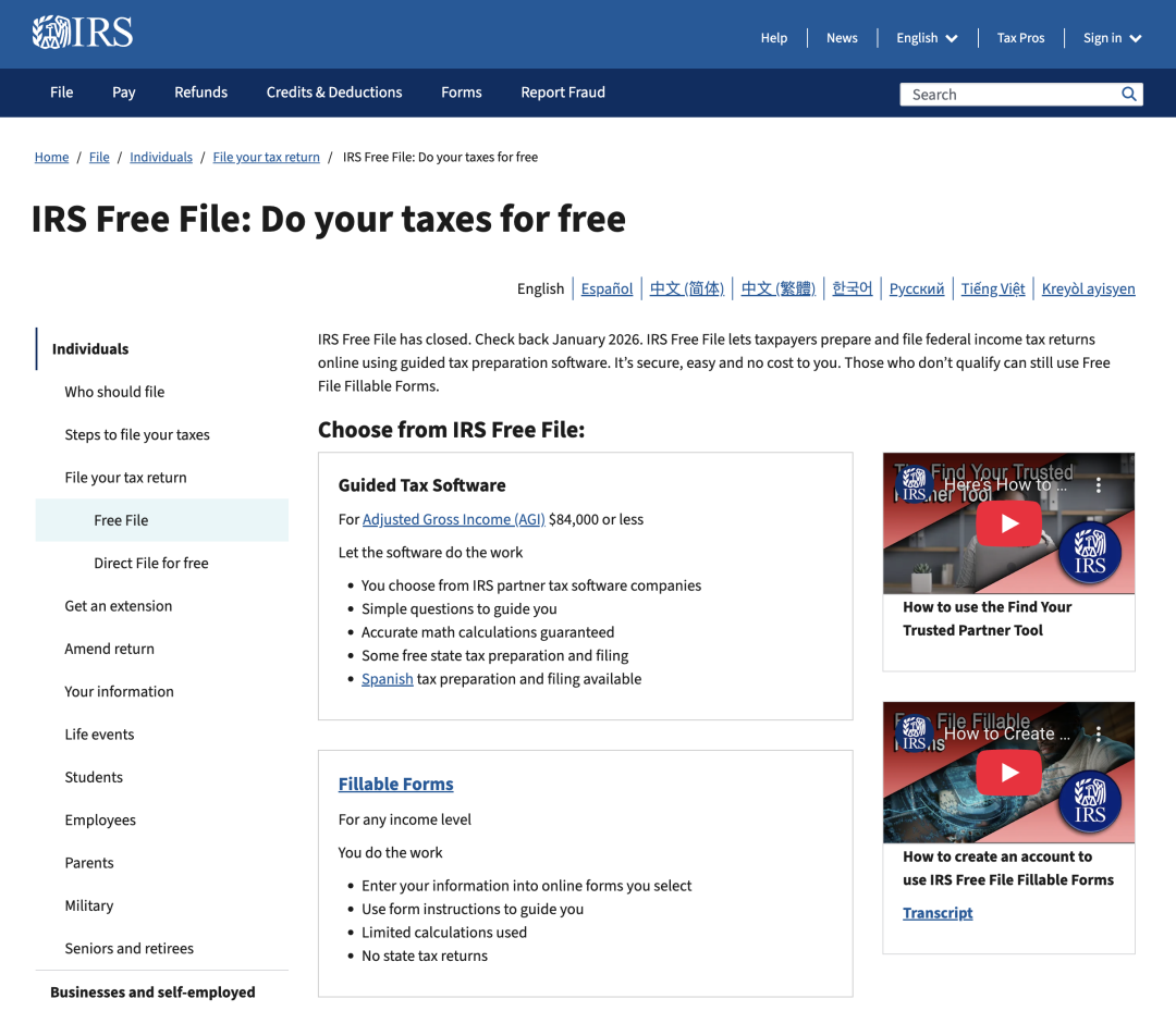 如果你的调整后总收入(AGI)在84,000美元或以下,那么IRS Free File仍然是最稳妥的免费选择。这一项目由IRS与多家报税软件公司合作推出,符合条件的用户可以通过官方入口,免费使用合作软件完成联邦报税。
