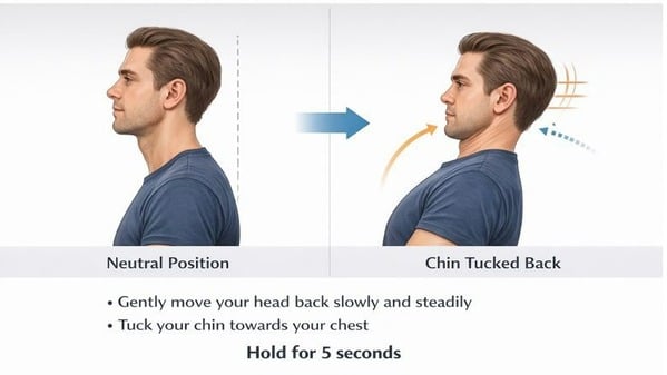 将头部保持在中立位置,直视前方,将下巴朝胸部略微向下收,收起下巴时,缓慢而平稳地向后滑动头部。保持拉伸5秒,然后重复五次。