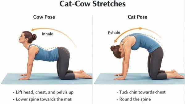 双手和膝盖着地,双臂与肩同宽,双腿与臀部同宽。吸气,抬起头、胸部和骨盆朝向上,将脊柱朝地板放低。保持姿势伸展5秒时呼气。随后,抬起脊柱时吸气,并轻轻地将下巴向胸部收拢。想像猫害怕并炸毛时的样子。呼气,保持姿势5秒钟,然后吸气。重复上述步骤,交替摆姿势,重复十组。