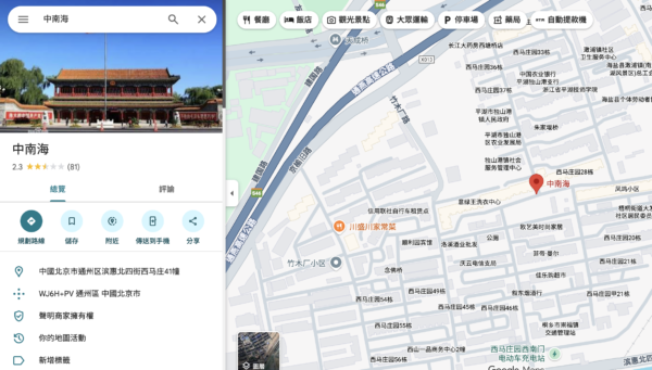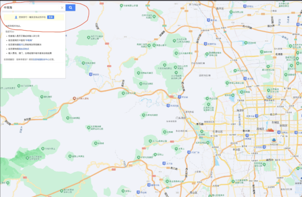 使用国际版Google上,虽可以搜索“Zhongnanhai”或“中南海”,虽有搜索结果,不过却是导往北京通州。