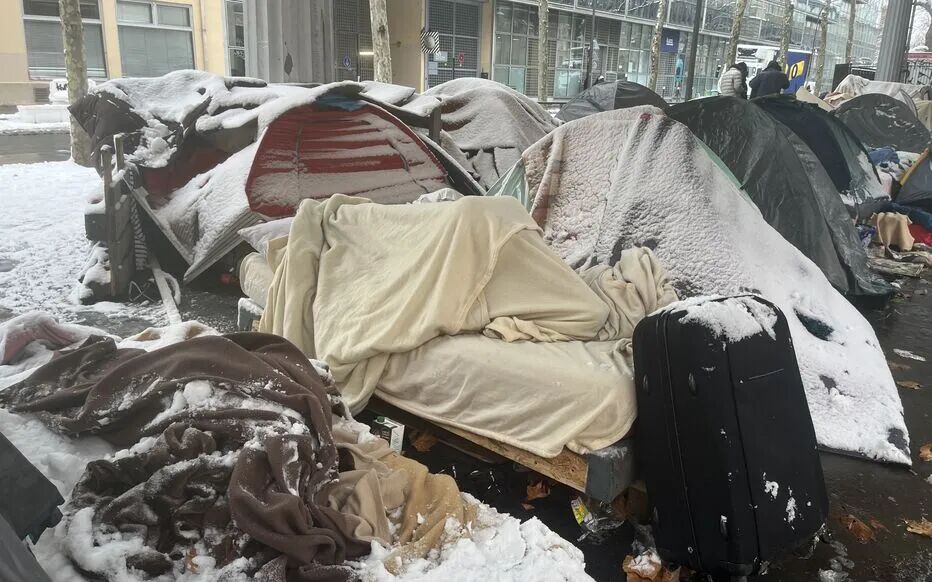 巴黎十区维莱特大道(boulevard de la Villette)117号营地,白雪覆盖帐篷,有人仅垫床垫、裹救生毯。年轻男子轻扫毯上积雪,叹“这就是现实”。