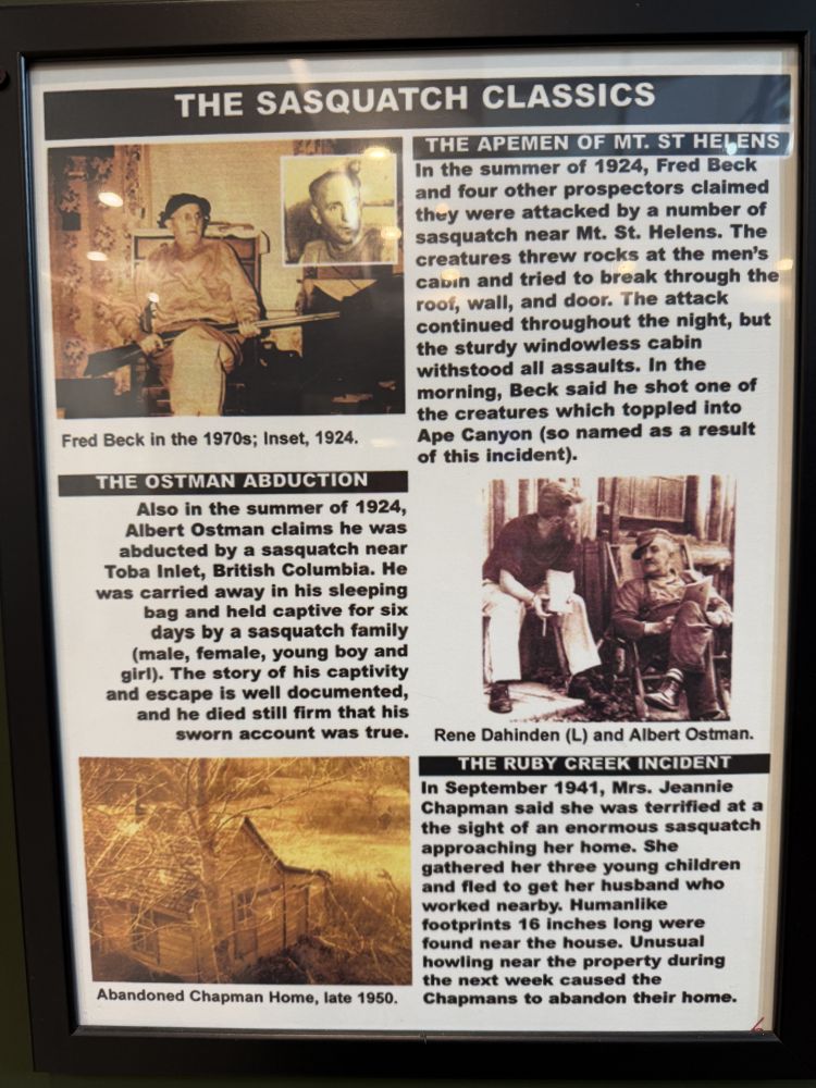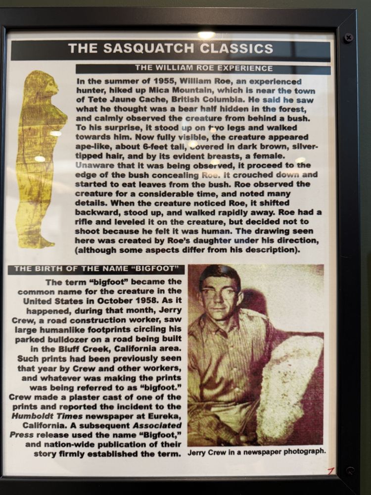 我随即上网一查,发现这个小镇竟然号称加拿大的野人大脚怪之都!大脚怪是美国的说法,在加拿大叫萨斯瓜赤(源于原住民的叫法),中国则叫野人。