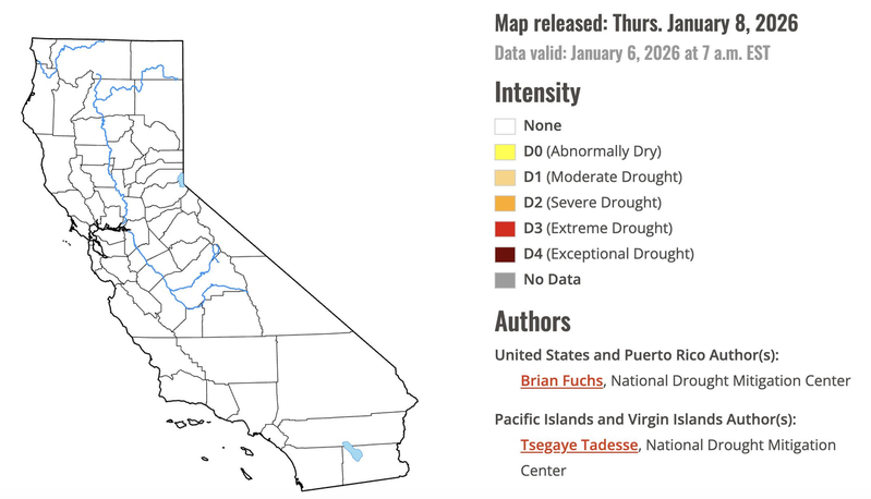 2026年1月8日的干旱状态为一片白,这也意味着整个加州已脱离干旱。 这是加州25年来首次完全没有任何干旱区域的时刻。 (美国干旱监测官网截图)