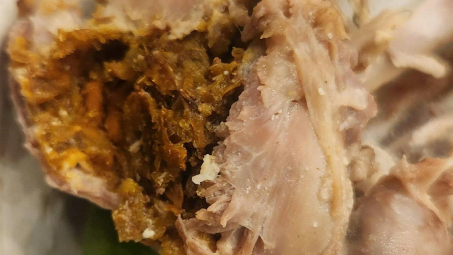 看起来那个被指为『鸡屎』的部位,实际上是鸡的砂囊。本应在屠宰加工时就移除,但供应商显然漏掉了这个程序。