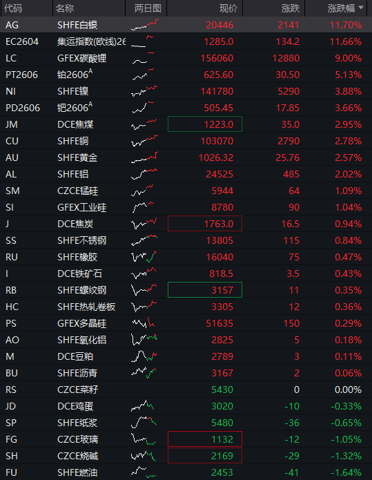 商品:国内商品期货普涨,截至发稿,沪银涨11.5%,集运指数涨11.2%,碳酸锂涨9%,铂金涨5%,沪镍涨4%,钯金涨4%,沪铜涨3%,沪铝、沪金、焦煤涨超2%,工业硅、锰硅、不锈钢涨超1%,卵唐钢、热卷板、橡胶、氧化铝、沥青、焦炭、多晶硅、豆粕等走高。纸浆、烧碱等下跌,玻璃跌超1%,燃油跌2%。