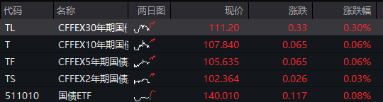 债市:国债期货全线走高,截至发稿,30年期主力合约涨0.30%,10年期主力合约涨0.06%,5年期主力合约涨0.06%,2年期主力合约涨0.03%。
