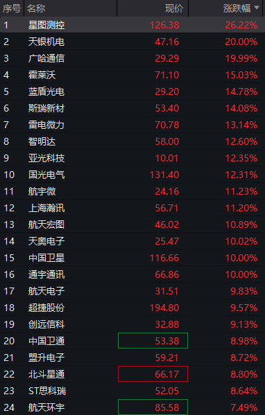 商业航天再度大涨,星图测控涨超26%,天银机电、广哈通信20CM涨停,蓝盾光电、斯瑞新材、雷电微力智明达、亚光科技、国光电气等涨超10%。