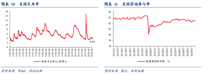 2、失业率意外回落,录得4.4%(4.375%),预期4.5%,前值4.5%(4.536%)。劳动参与率从62.46%降至62.40%,预期62.4%。失业率下行主要源于就业增长和供给小幅收缩,前者影响约0.14个百分点,后者影响约0.03个百分点。