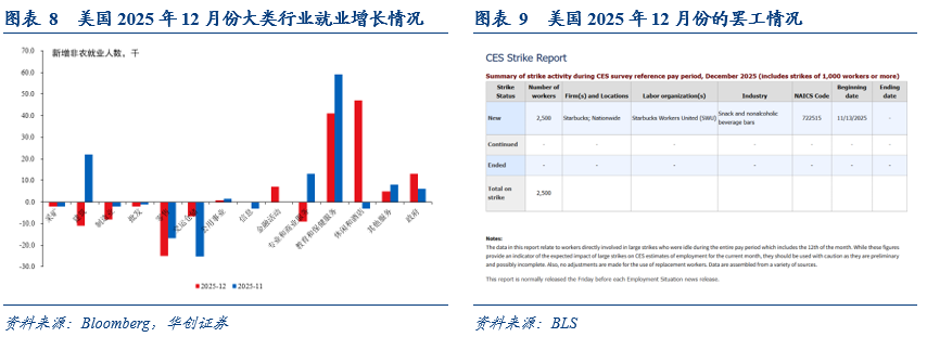 从大类行业来看,12月份的就业增长主要集中在两个行业,教育保健服务(+4.1万,前值+5.9万)、休闲和酒店业(+4.7万,前值-0.3万)。零售(-2.5万,前值-1.69万)、建筑(-1.1万,前值2.2万)、制造业、采矿、批发、交运仓储、专业和商业服务的就业萎缩。12月新增一起罢工,对新增就业人数的拖累约0.25万。
