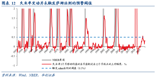 失业率的3个月移动平均值较过去12个月低点高出0.33个百分点,低于萨姆法则的预警阈值(0.5个百分点)。