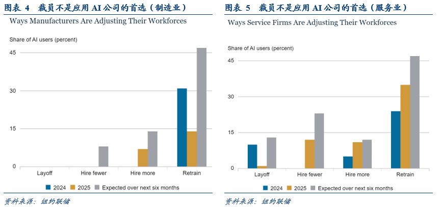 再次,AI带来的裁员影响可能有多大?约0.55-0.75万人/月。根据挑战者公司最新报告,2025年因AI直接导致的裁员约5.5万人,若叠加“技术更新(可能涉及AI)”类别下的2万裁员,AI相关的裁员总规模约7.5万人。需注意,海外目前并没有对AI就业影响的一致性区间估计,纽约联储的调查[4]也显示,虽然AI在美国企业中的采用率快速提升,但企业更偏向于对员工进行再培训,而不是直接裁员。