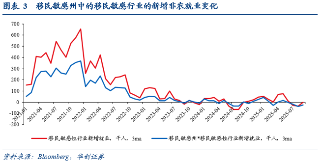 其次,收紧移民政策的拖累约3.3万。如果借鉴明尼阿波利斯联储直接从供给侧估算的方法,拖累约6.7万,但可能会高估,因其忽略了劳动力需求走弱的影响,也与薪资数据相悖(净移民边际减少会导致低端劳动力供给下降,如果需求不变,应看到低薪工人的薪资增速回升)。直观方法是观察移民敏感行业和移民敏感州的就业人数变化。建筑、交运仓储、休闲酒店、制造、商业服务和零售雇佣了约78%的非法移民。加州、德州、佛罗里达等十个州雇佣了69%的非法移民。计算移民敏感州中的移民敏感行业的就业变化,2024年月均新增就业约0.8万,2025年三季度(最新数据)约-2.5万,减少约3.3万。
