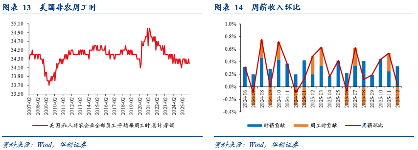 3、时薪增速符合预期,但周工时下滑。私人行业时薪环比0.3%,预期0.3%,同比增速3.8%,预期3.6%。周工时从34.3小时降至34.2小时,仍处于2015年以来的低位水平。周薪环比持平,并未增长(时薪是周薪和周工时的倒算值)。