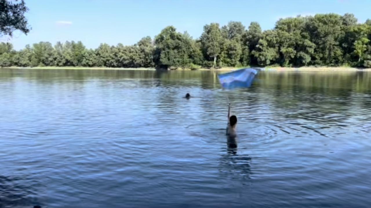 Verdis 人在河中挥舞国旗。