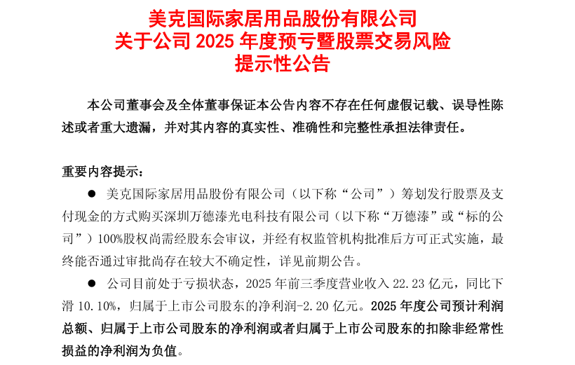 1月9日,美克家居发布了《关于公司2025年度预亏暨股票交易风险提示性公告》。公告表示:“公司目前处于亏损状态,2025年前三季度营业收入22.23亿元,同比下滑10.10%,归属于上市公司股东的净利润-2.20亿元。2025年度公司预计利润总额、归属于上市公司股东的净利润或者归属于上市公司股东的扣除非经常性损益的净利润为负值。”