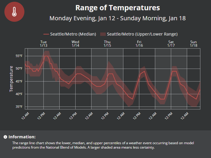 预计周二的最高气温将达到55华氏度,为本周最温暖的一天,其余几日的气温多在45至55华氏度之间徘徊。本周降水预计较少,直至下周四(22日)才可能迎来持续五天的降雨。上周末袭击华盛顿盅眺部地区的“大气河流”已于本周一(12日)逐渐减弱。