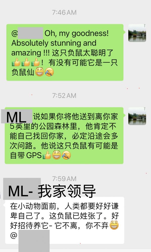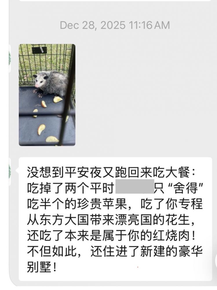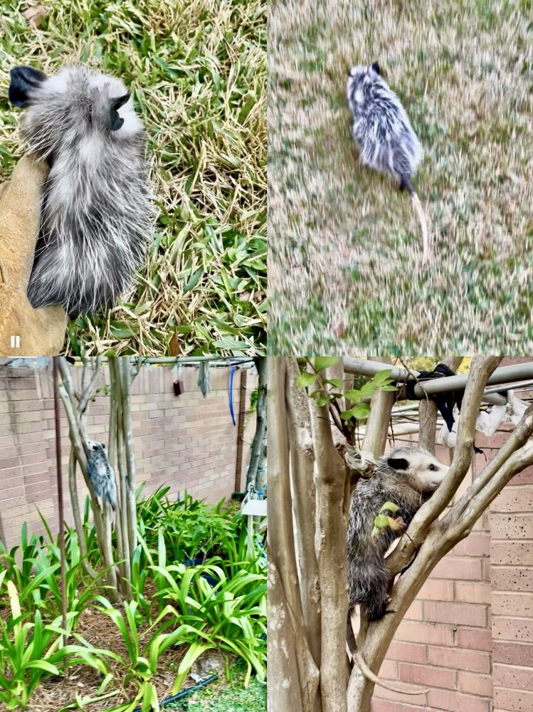 照片8-9: 接下来发生的事出乎所有人的预料,这只负鼠居然长途跋涉5英里(8公里)于9天后奇妙地又回到了好友YH/CY家!我家领导说如果没有GPS导航以及不能向别人问路,他是做不到的;我也做不到。这只负鼠太神奇了!