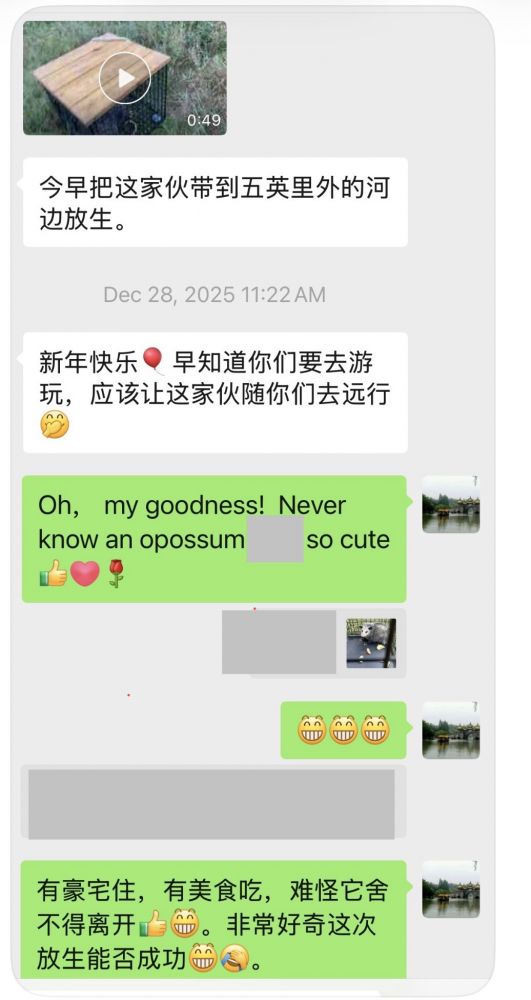 我们乘圣诞假期7天邮轮回来后得知,好友YH将这只小动物在圣诞节前几天再次放生,希望它回归大自然享受自由自在的生活,没料到的是这只小动物在平安夜又自投罗网回来过节。在照顾它好吃好喝一番之后,YH于12月28日将它送到离家5英里(8公里)之外的森林小溪边,认为这次肯定能成功送走这位不速之客。错!!!出乎所有人的预料,这只小动物长途跋涉9天奇妙地于1月6日又回到了好友YH/CY家;好友YH开玩笑说这只小动物是回来为我们送行的。我们次日(1月7日)离开休斯敦,YH在同一天将这只小动物送到离家15英里(24公里)之处,那里有这只小动物生存的良好环境,希望它在那里好好生活。