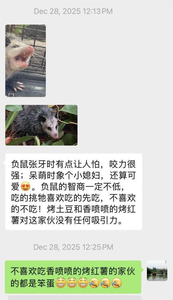照片2: YH分享他拍的这张负鼠及其爱吃的食物照片,还配了一段文字“这家伙破坏性不大,吃我种的菜能礼貌,一棵一棵整株吃,且按顺序依次食用;不象松鼠没有教养,满园糟蹋,树上摘果,菜下挖根,破坏力强,还经常带着侮辱性很强的动作向我示威!最近一直没有松鼠入笼,不然的话一定让牠们同住一段时间,让负鼠教教松鼠文明做鼠的道理!