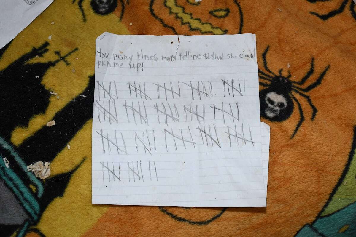 在女孩睡铺附近,调查人员还发现了一张令人心碎的纸条——一页略有撕痕的线装笔记本纸,上面用铅笔写着标题:《妈妈跟我说了多少次她不能来接我!》。纸上密密麻麻画满了80多个记号,象征母亲一次次失约。