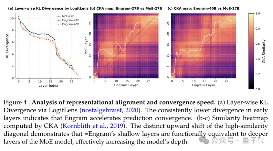 Engram让模型的早期层不再需要做特征组合的“苦力活”,KL散度曲线显示Engram模型的预测收敛速度明显更快。更直观的证据来自CKA相似度矩阵,Engram-27B第5层的表征,和MoE基线第12层的表征最为相似。