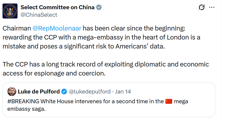 美国国会众议院中国问题特设委员会(全称:美国与中国共产党战略竞争特设委员会)在华盛顿时间星期二(1月13日)晚间发表声明说,“委员会主席(约翰·)穆勒纳尔(John Moolenaar)从一开始就很清楚:用在伦敦市中心的一个超级大使馆来奖励中共是一个错误,并且会对美国人的数据构成重大风险。声明还说,“中共长期以来一直有利用外交和经济渠道从事间谍和胁迫活动的记录。”
