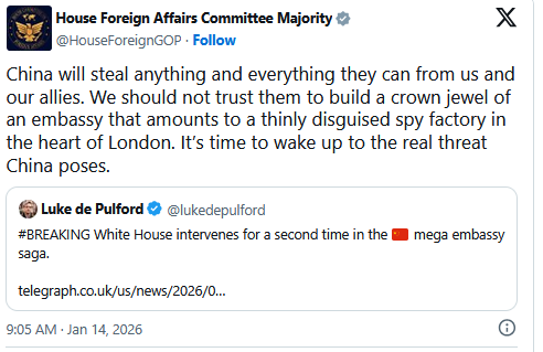 美国国会众议院外交委员会的共和党差不多在同一时间在X平台发表评论说,“中国会从我们和盟友那里窃取一切能偷的东西。我们不应该相信他们会在伦敦市中心建造一座华美的大使馆,这不过是一座伪装拙劣的间谍工厂。是时候认清中国构成的真正威胁了。”