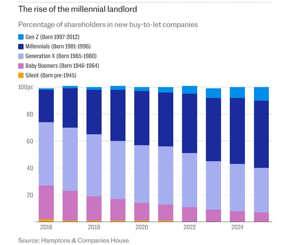 房地产机构Hamptons的最新数据印证了这股风潮:千禧一代——即1981至1996年间出生的人——首次占据了英格兰与威尔士地区“购房出租”有限公司新股东的半数。值得注意的是,他们自身拥有住房的比例,却远低于父辈。