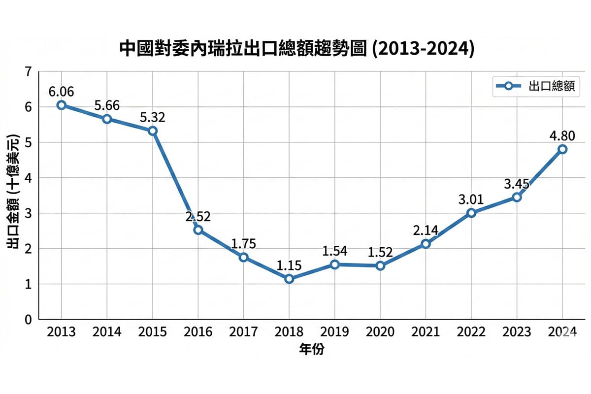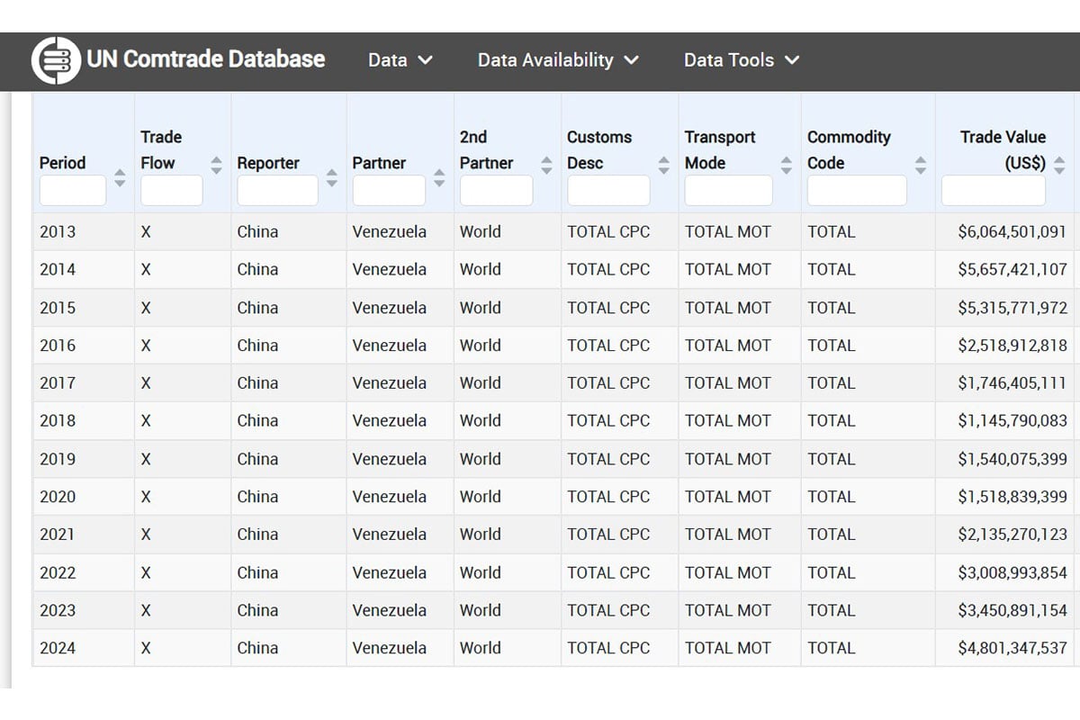 委内瑞拉连接加勒比海和大西洋贸易路线,使其成为中共“一带一路”倡议中的天然节点。中国也有不少企业活跃于委内瑞拉的电信、能源、基础设施和“一带一路”项目,包括最新的海上航线和电讯支持。而中国对委内瑞拉出口也保持增长,根据联合国国际贸易资料库,2023年,中国对委内瑞拉的出口额为34.5亿美元,委内瑞拉对中国出口约7.39亿美元。2024年中国对委内瑞拉的出口额为48亿美元,委内瑞拉对中国出口约3亿美元。
