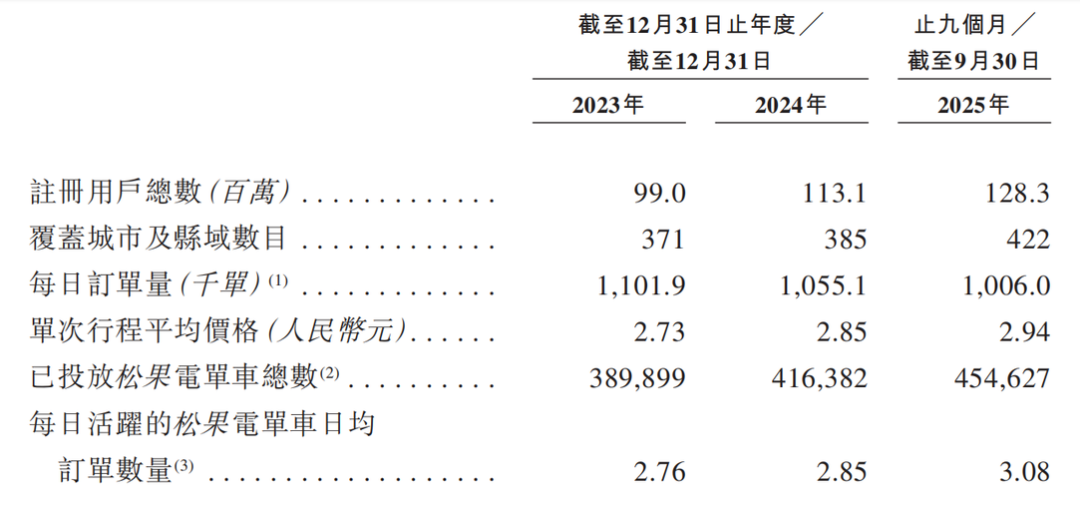 注册用户数从2023年末的9950万,一路增长至2025年9月底的1.28亿,累计新增超过2800万用户;投放的车辆总数也从40万辆增加至45.4万辆;活跃车辆的日均订单量甚至从2.95单微增到了3.08单;单次骑行的平均价格也从2.86元涨到了2.94元。
