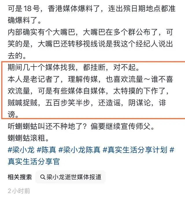 这一消息的传出,经纪人透露内部出了一个大嘴巴,大嘴巴将所有的事情在各个群里曝光了,但对外声称此事是梁小龙经纪人透露,由此也就有了如今的“去世细节”。
