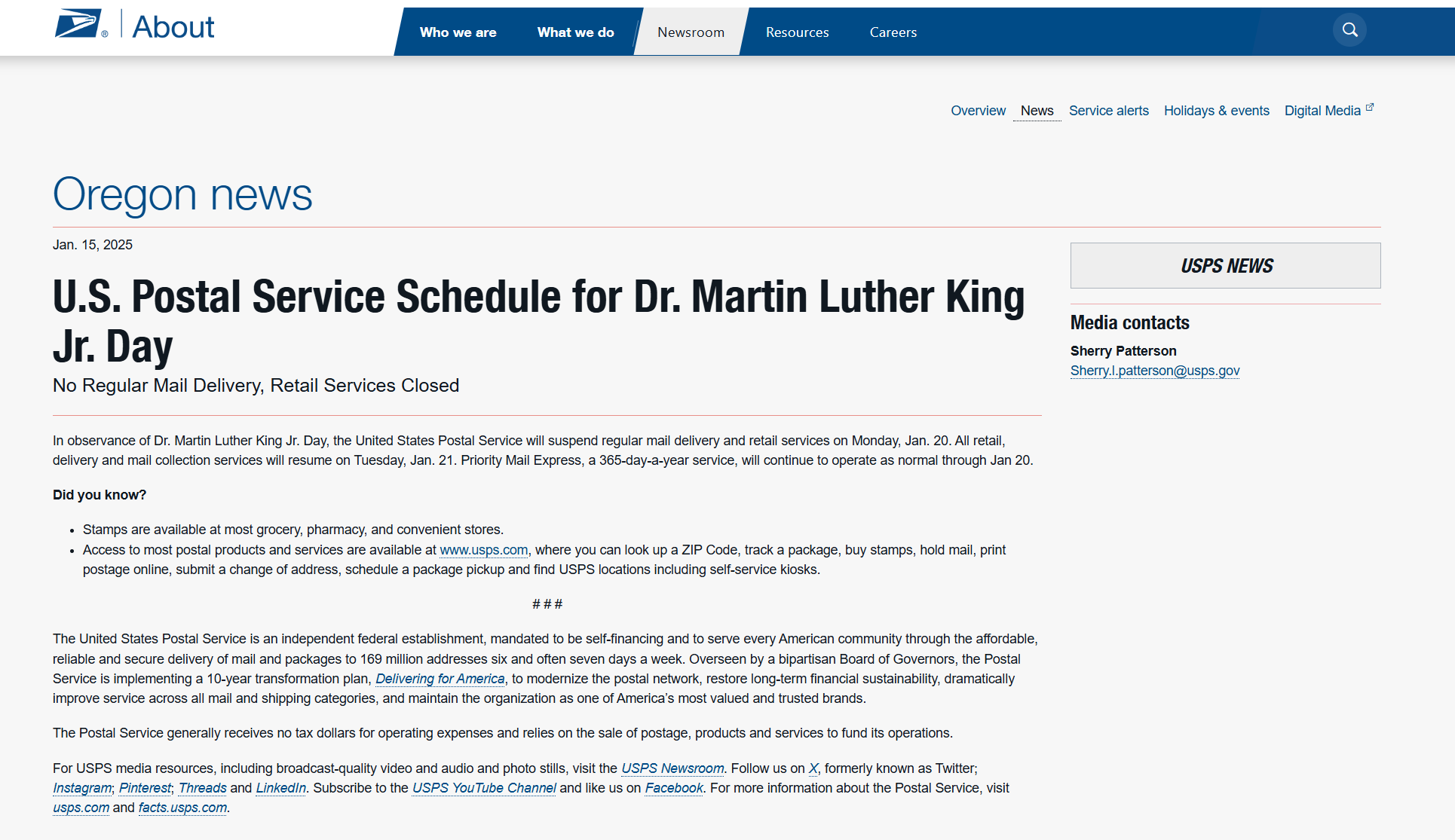 纪念日当天暂停邮件投递并关闭邮局窗口,所有服务将于1月20日周二恢复。