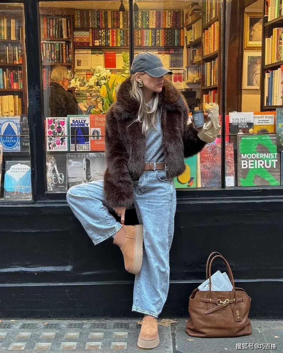 用浅蓝色牛仔裤化解皮草的雍容华贵感,是普通素人外穿皮草最安心的办法,浅色皮草搭配水洗蓝牛仔裤清新文艺,深色皮草搭配水洗蓝牛仔裤基础养眼。