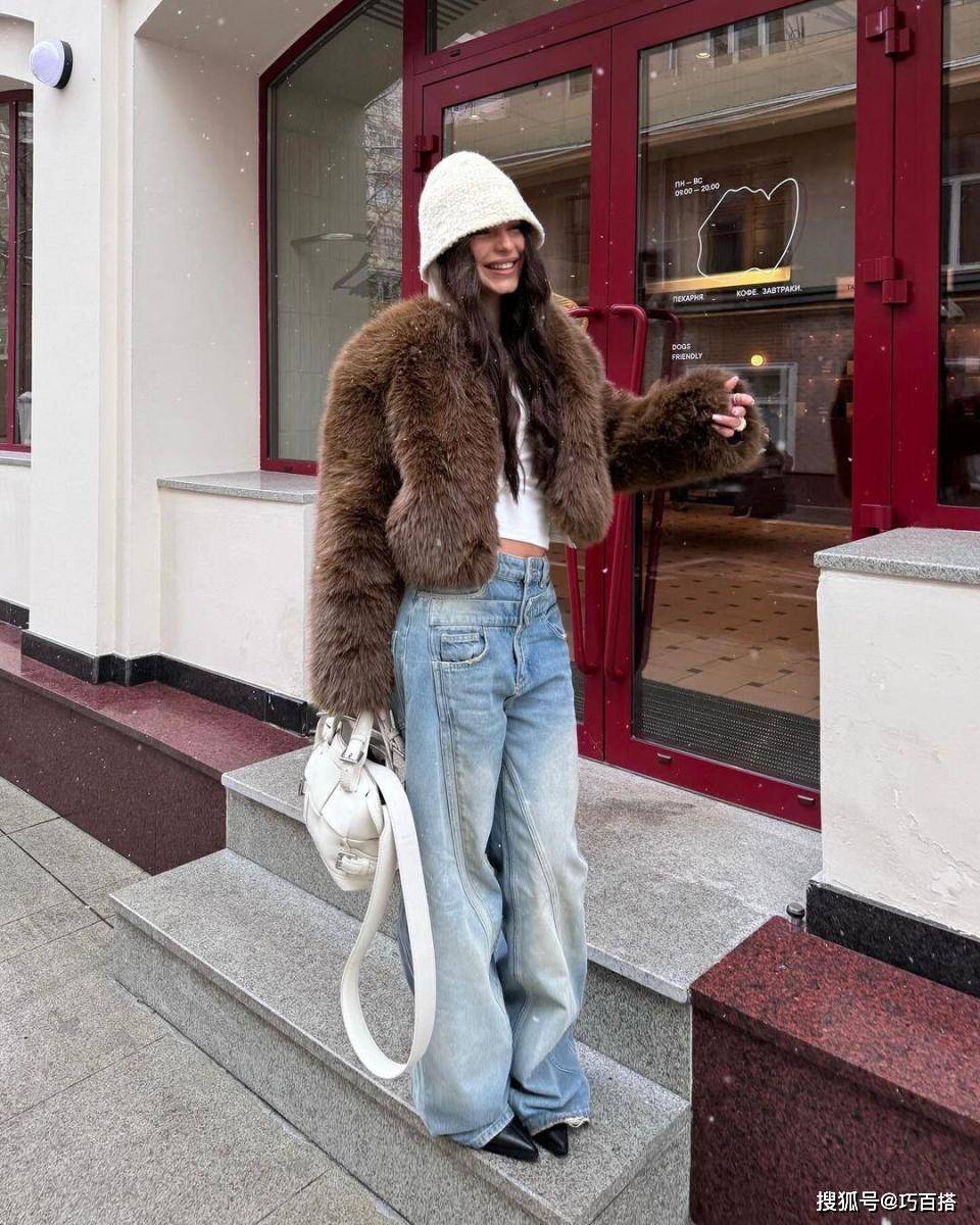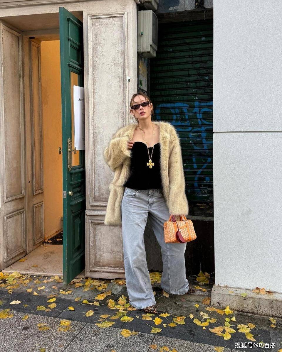 水洗蓝牛仔裤与皮草外套搭配,起到的作用有三个: