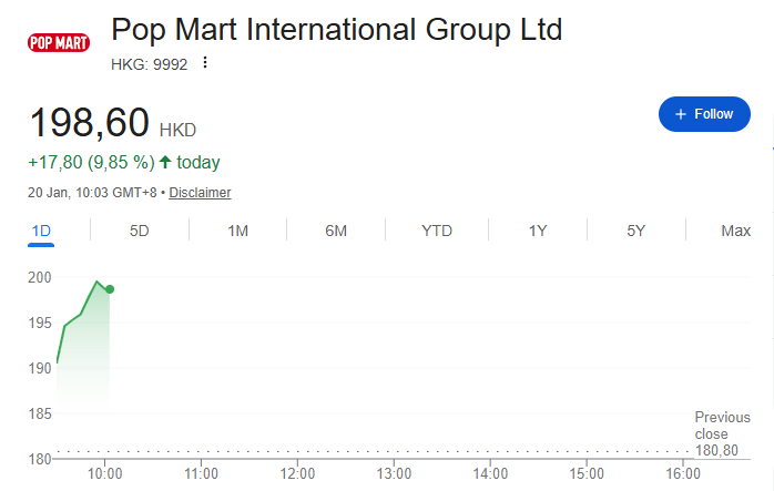 1月20日周二港股开盘,泡泡玛特大涨10%,报198.60港元。此前一天,公司以2.51亿港元大手笔回购140万股,用真金白银向市场传递信心。