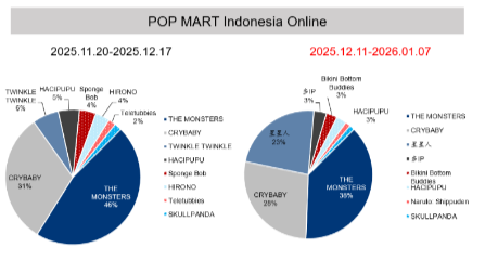 在渠道建设更成熟的东南亚市场,这种趋势更为明显。在印尼的TikTok热销榜中,Labubu占比已低于40%,星星人和Crybaby两个新IP的合计占比可达50%以上。