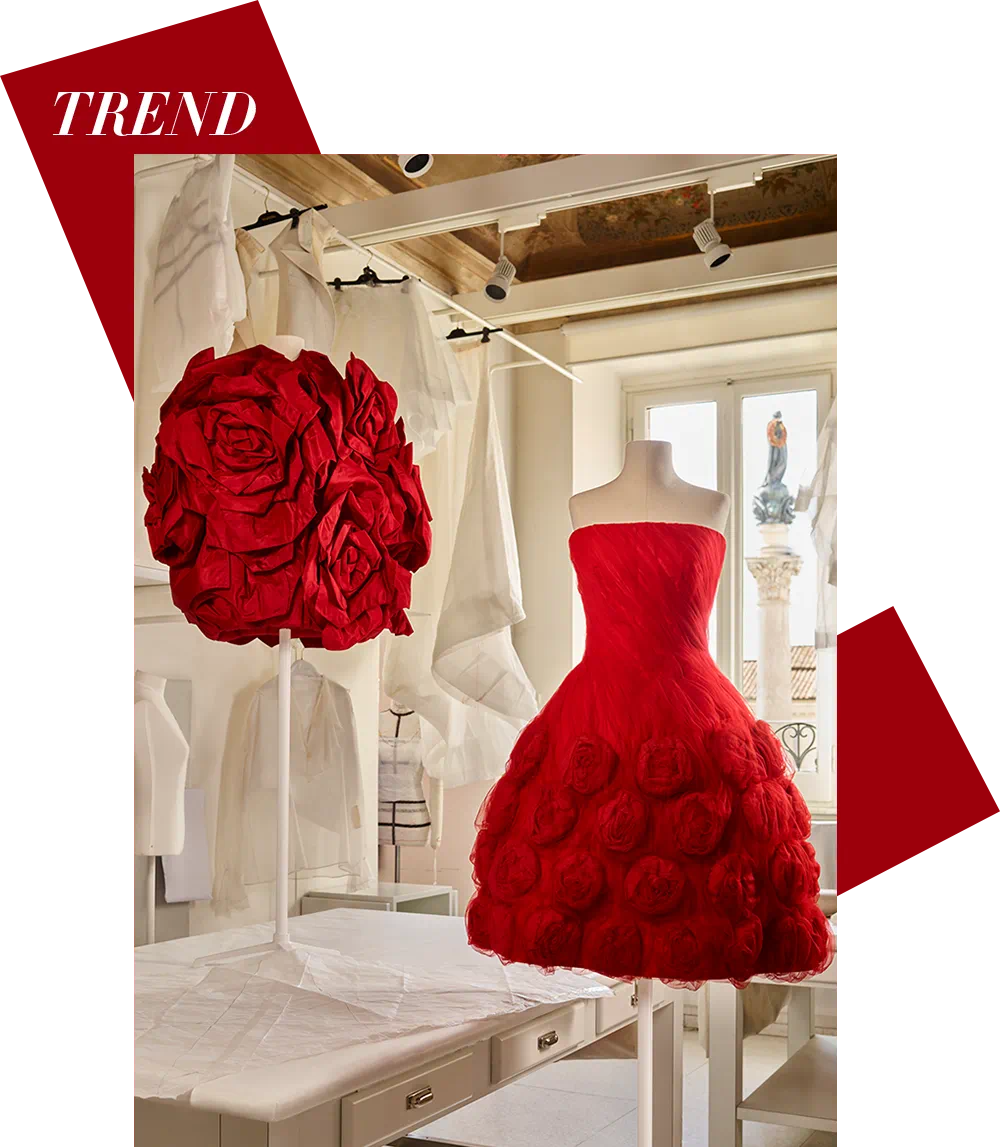 它在Valentino 1959春夏系列首次登场,出现在一条名为“La Fiesta”的无肩礼服上,薄纱裙摆缀以立体玫瑰,最为惊艳的是那抹耀目鲜红,很快成为品牌的象征,被称之为“Valentino Red”。