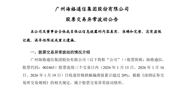 面对股价过山车似的波动,海格通信不得不在1月20日发布了《股票交易异常波动公告》。公告表示:公司“股票连续三个交易日内(2026年1月15日、2026年1月16日、2026年1月19日)日收盘价格跌幅偏离值累计超过20%,根据《深圳证券交易所交易规则》的相关规定,属于股票交易异常波动情形”。公告说:“公司近期生产经营情况正常,内外部经营环境未发生重大变化”,而且“公司股票交易异常波动期间控股股东、实际控制人未买卖公司股票”等,以安抚投资者。