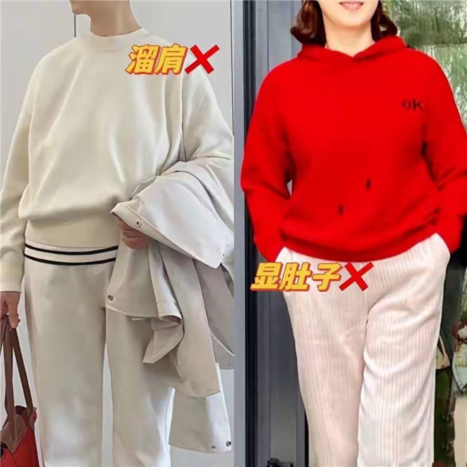 溜肩款的白色毛衣穿在身上,导致整个身材没有那么挺拔,选择宽松的卫衣来搭配,又会显肚子,所以穿衣打扮细节决定了成败。