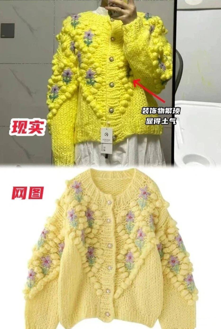 有的时候不光要会穿,还要会买才行,例如上面这一件装饰物很繁琐的,黄色毛衣上身效果之后真显土气,就算是高颜值的时尚博主来穿,也驾驭不住。
