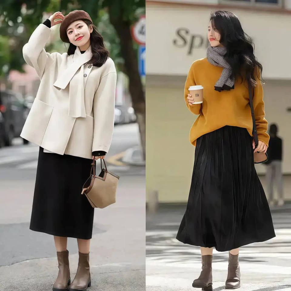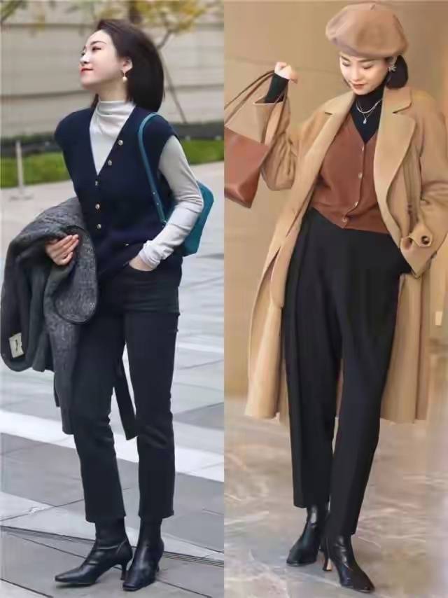 选择一条九分的黑色牛仔或西装裤,让脚踝与靴筒完美衔接,那是对腿部线条最极致的延伸。上身不妨用针织开衫或马甲叠穿毛衣,在慵懒中编织出丰富的层次。