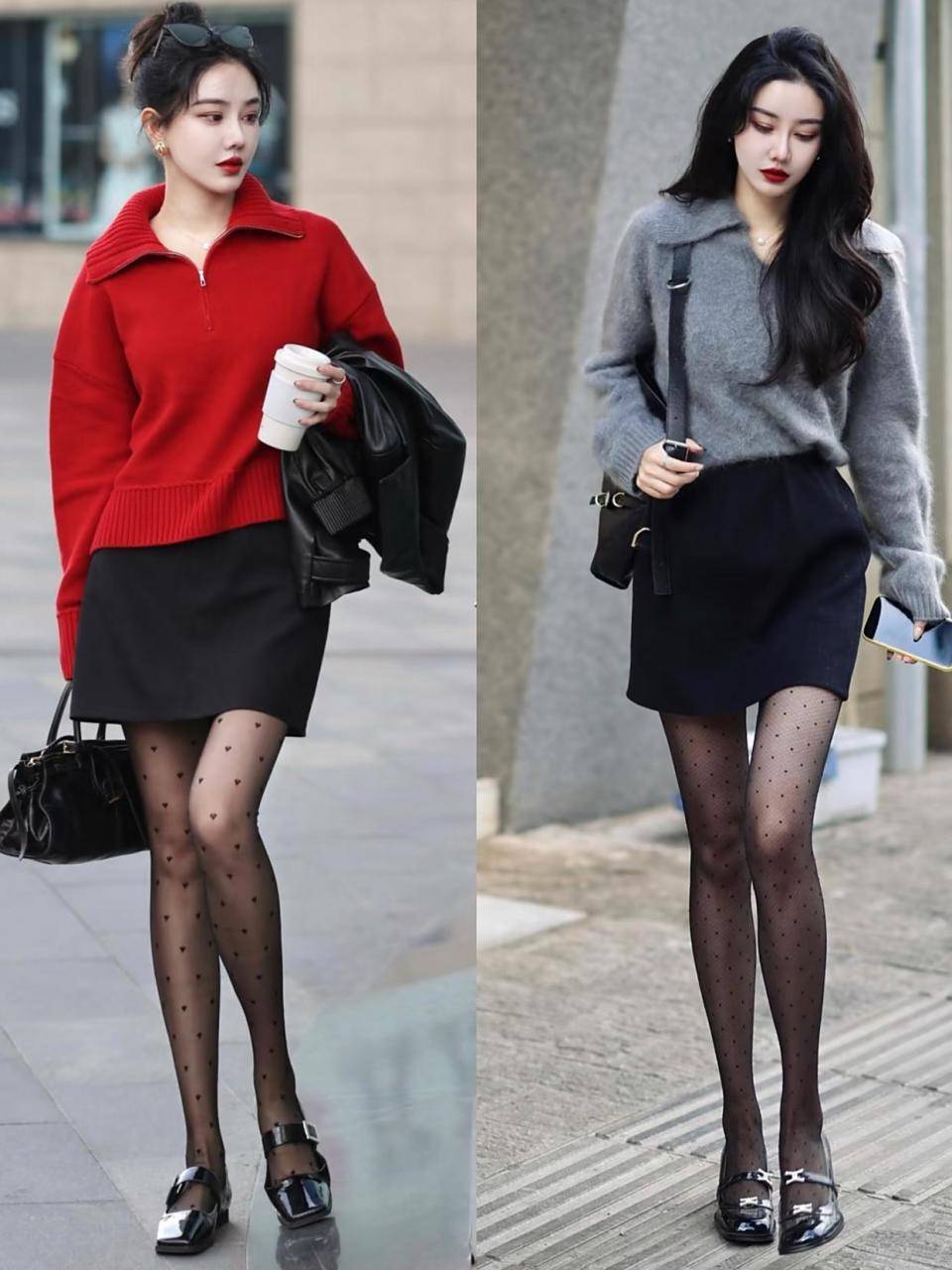身材高挑的你,可以尝试“下衣失踪穿法”,直接选择一件灰色毛衣搭配大地色系a字短裙,脚穿黑色豆腐鞋,加上一双棕红色和黑色拼接的中筒袜,这样的打扮更容易呈现出大长腿,抢眼又吸睛。