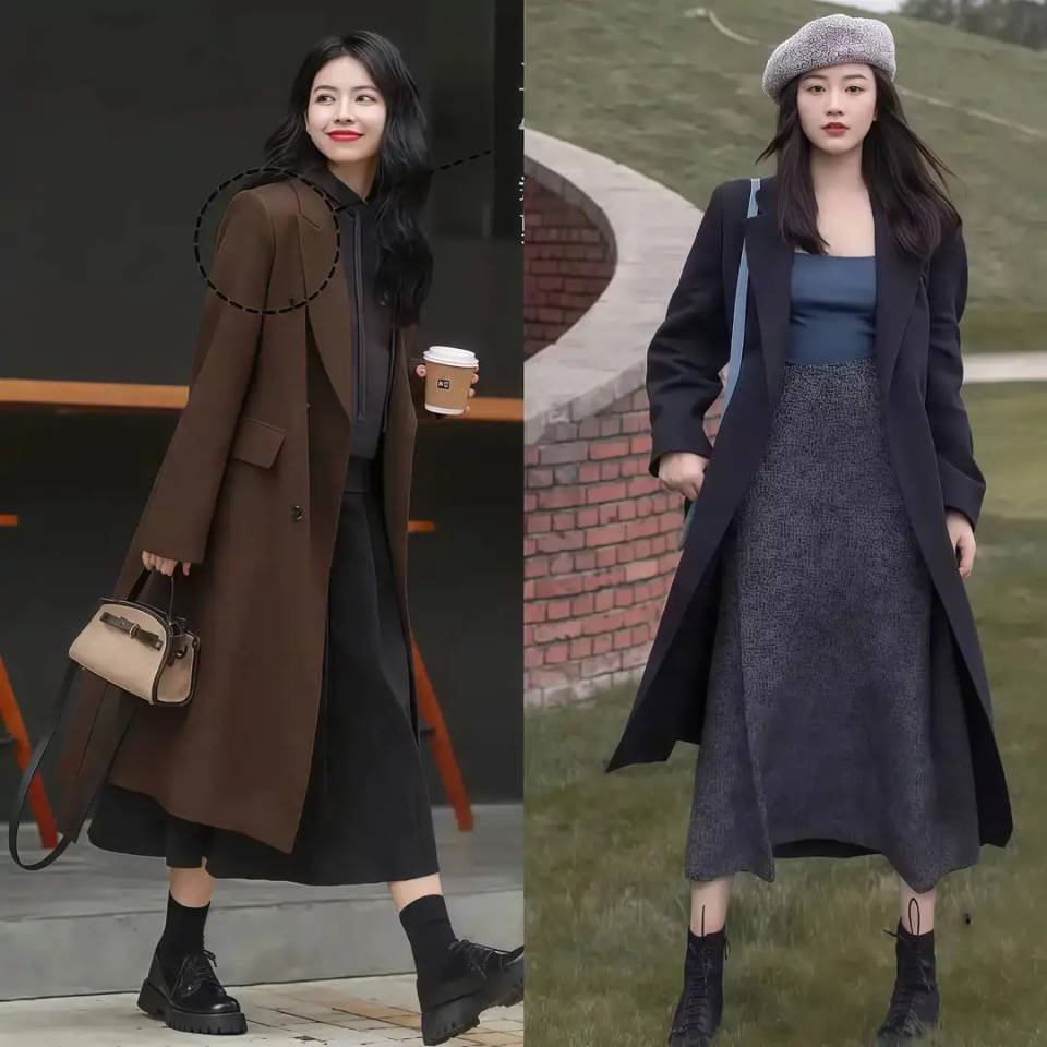 冬季末尾和春季交替的时间段也还是很冷,这时候确实需要一件大衣外套穿在身上更保暖,大衣版型选择翻领的款式会更利落,衣服长度过膝,不过脚踝不容易压身高,而且裙子长度要比大衣长出这么一小截,更有层次感。