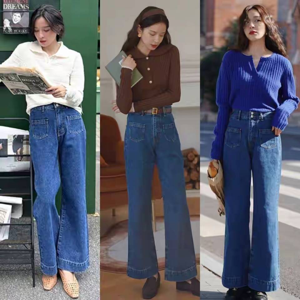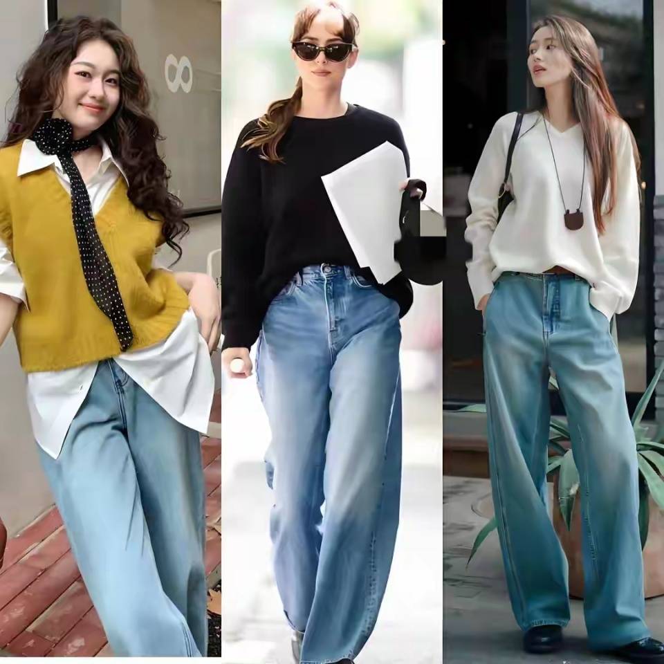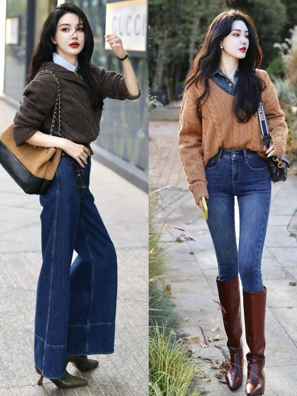 想象自己的穿搭偏休闲风,直接选择天生就拥有时尚元素的牛仔直筒阔腿裤,搭配上针织毛衣,不管你毛衣是白色棕色还是蓝色,都不会有任何违和感,配色更简单,降低了出错率。