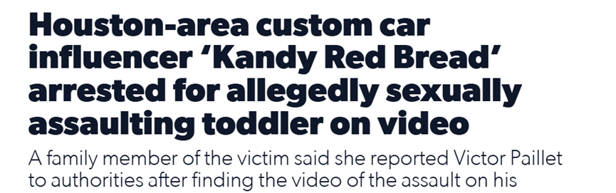 休斯敦改装车社群某个社交媒体网红因涉及一宗令人不安的、与一名两岁幼童有关的指控而被捕。