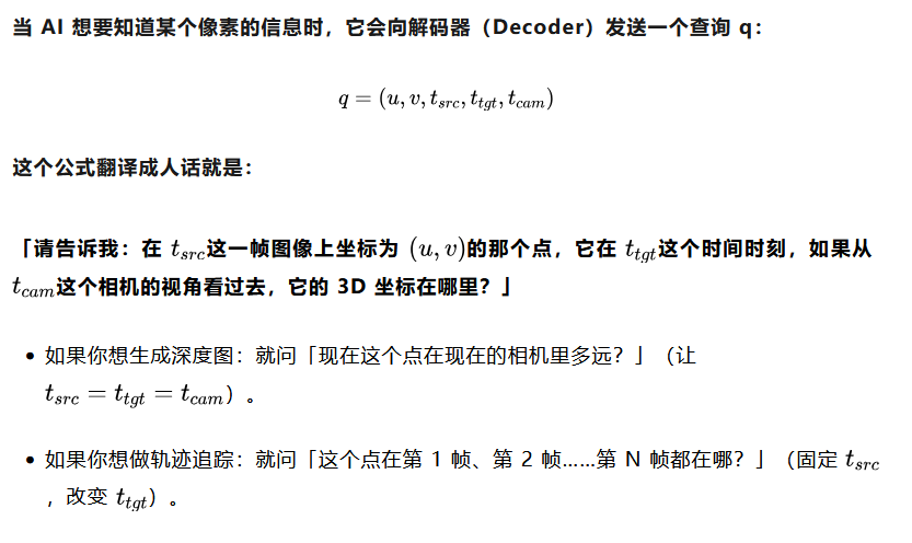 它把原本割裂的 3D 重建、相机追踪、动态物体捕捉,统一成了一个极简的“查询”动作。