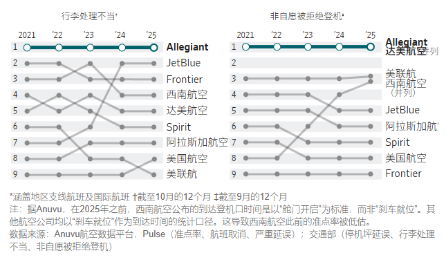 ---- 似曾相识:总体而言,航空公司的表现与前一年大致相同,没有急剧改善或下降。与2024年相比,行业在取消航班、行李丢失和拒载方面的平均水平基本持平。